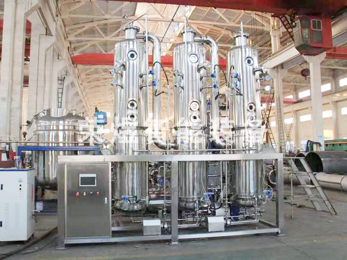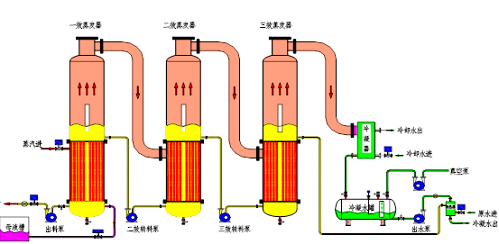 三效多級(jí)蒸發(fā)器,是一種采用列管式強(qiáng)制循環(huán)外加熱工作原理,物理受熱時(shí)間短、蒸發(fā)速度快、濃縮比重大,有效保持物料原效,廣泛適合于制藥、化工、食品、輕工等的液體物料的蒸發(fā)濃縮工藝過(guò)程,特別適用于高鹽廢水處理。