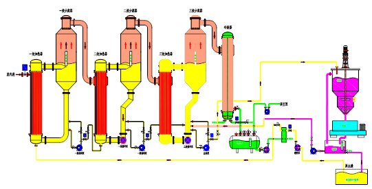 1、一效加熱器    2、二效加熱器    3、三效加熱器    4、一效分離器    5、二效分離器    6、三效分離器    7、預(yù)熱器    8、冷凝器    9、冷水罐